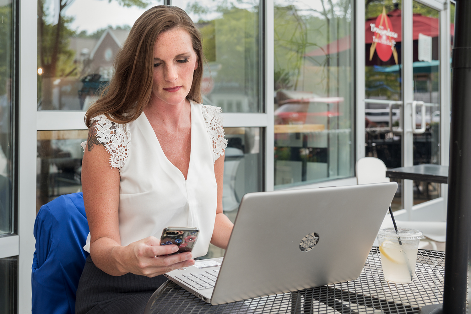 After Amy did her usual stellar job, Stacey and I headed to a local coffee shop in an area that had several different scenes that we could use. We did business, casual, some more headshots and what one agency called “Mom” shots.