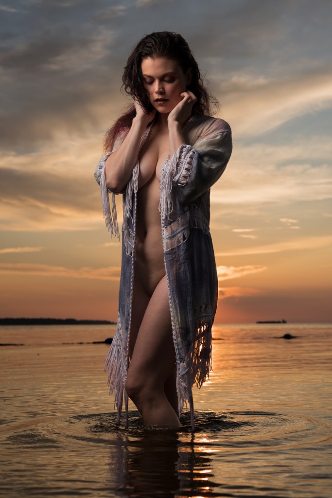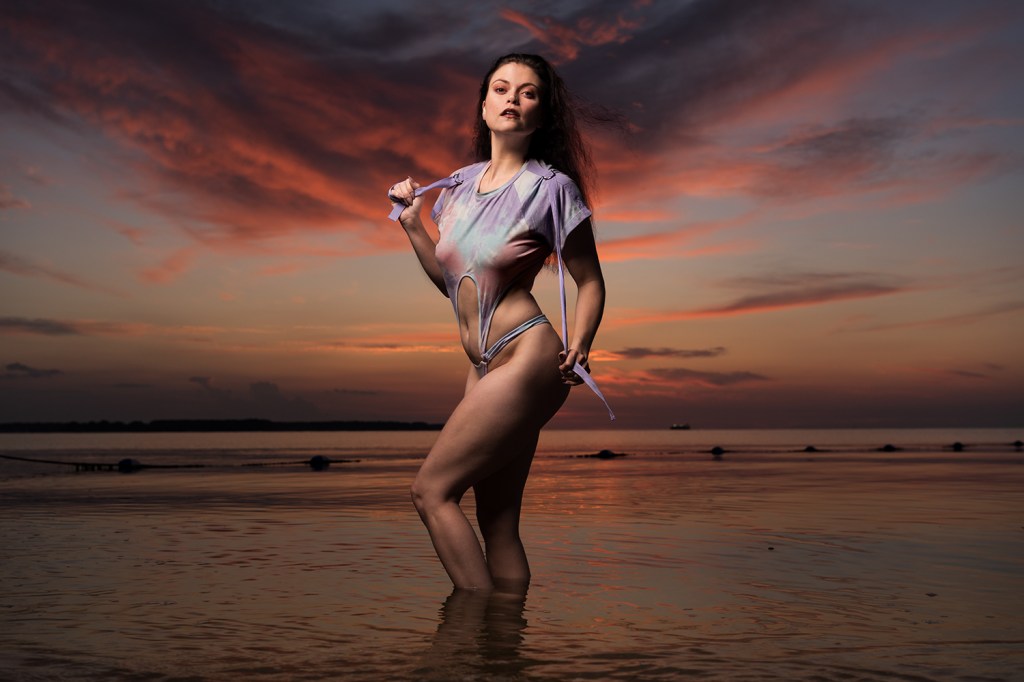 Yes, I said we. At this location, in these conditions, we were able to get in there and get the money shots. Her, me, the camera, and the strobe unit. At first I was at the water’s edge, laying on my side to get her against the luscious colors of the sunrise.