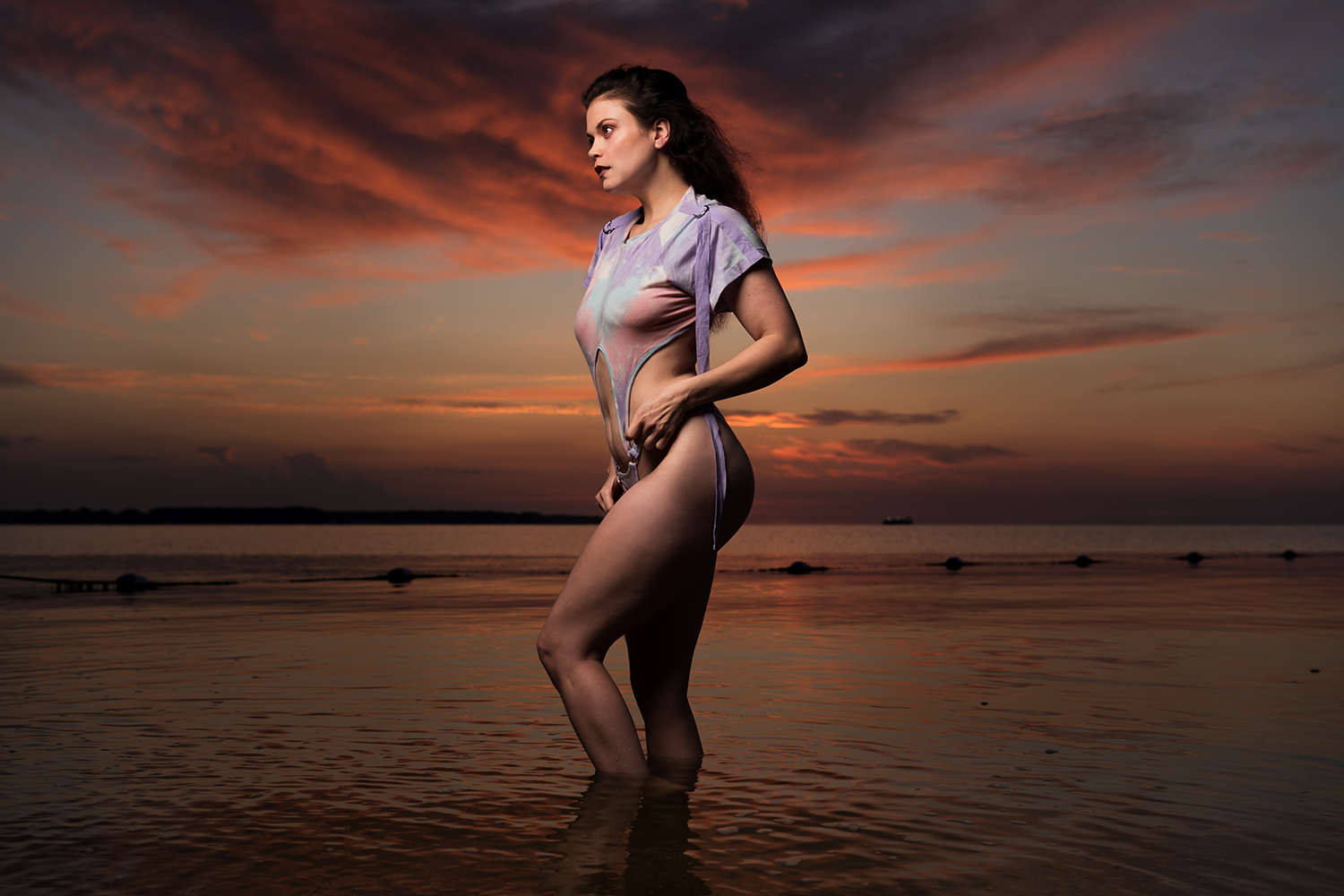 The best part of this session is that we started with exactly what we couldn’t get in the last one. Her, in the water, against a glorious sky. The water was calm when we started and provided an amazing reflection of the colors and subject. Conditions even managed to improve a little more as we shot until the water was almost glass-like near the end.